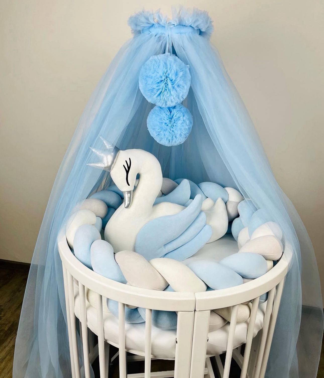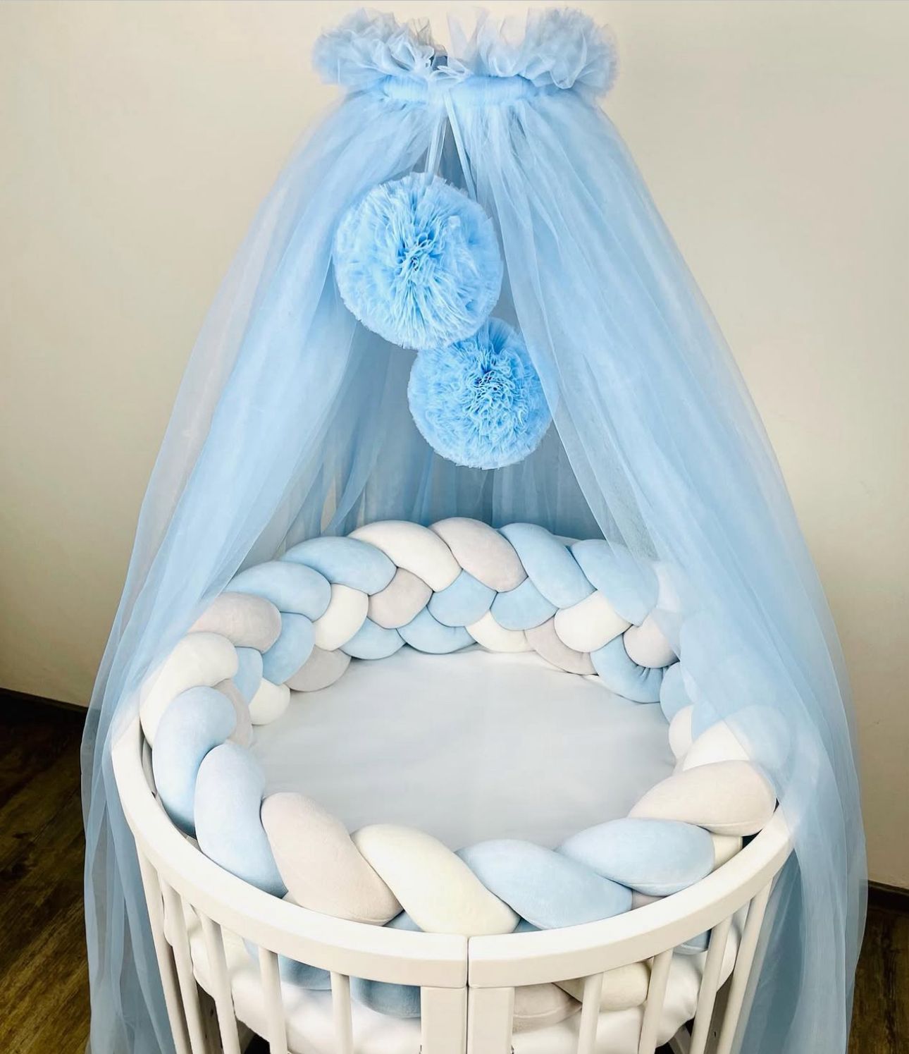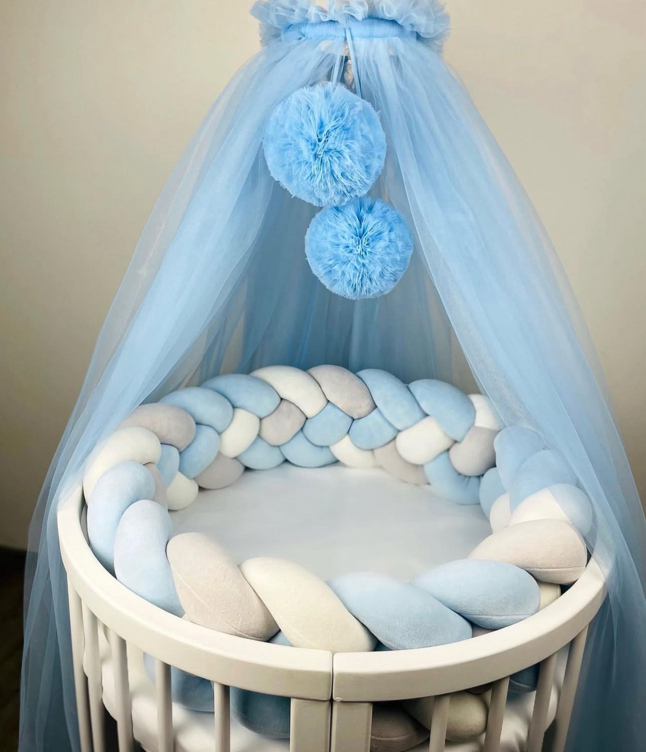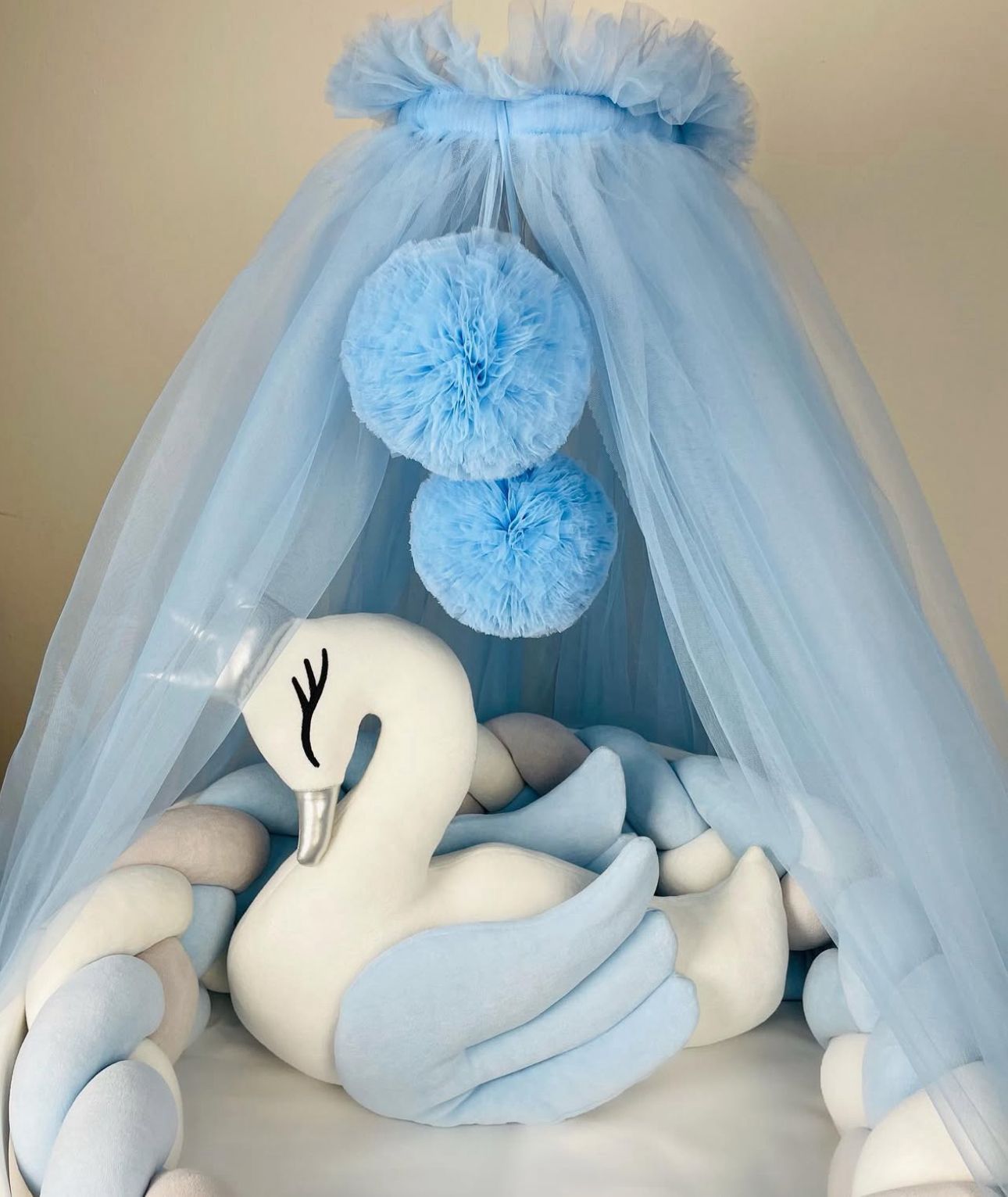 Betthimmel, Baldachin, Himmelbett mit Pompons Blau – Betthimmel für Babybett, Kinderbett, Wiege in Blau für Junge