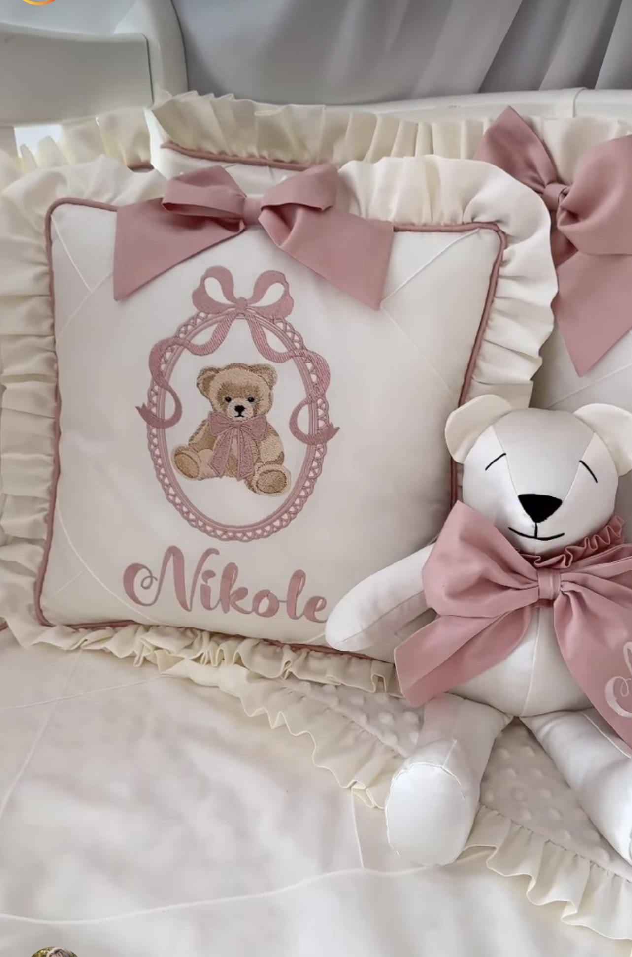 Unsere Deko-Kissen in Naturweiß und Altrosa mit Exklusive Bär Stickerei sind die perfekte Ergänzung für Ihr Zuhause. Stilvoll, gemütlich und ein echter Hingucker!