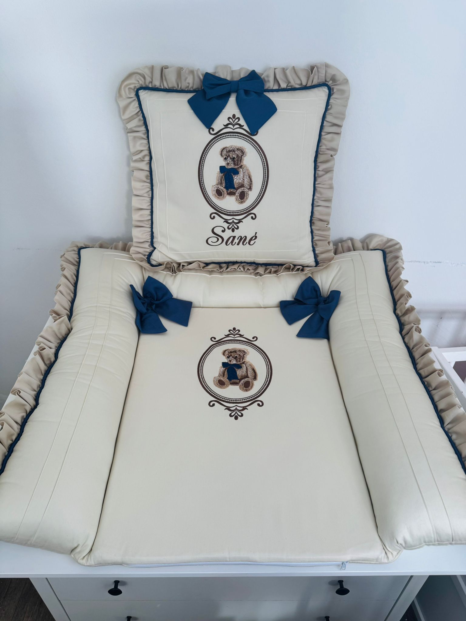 Wickelauflage Creme/Dunkelblau mit Bär Stickerei
