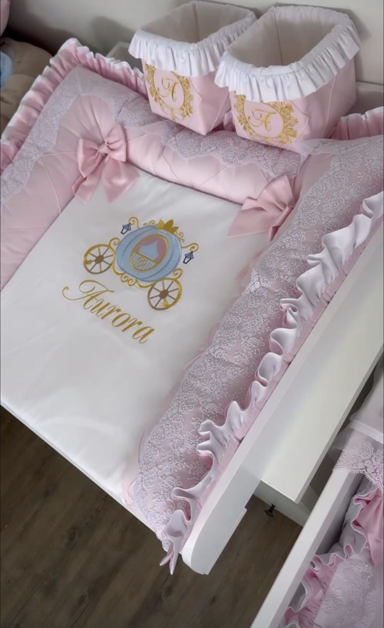Wickelauflage aus Satin-Baumwolle mit Rüschen, Schleifen und „Lianny“ Stickerei